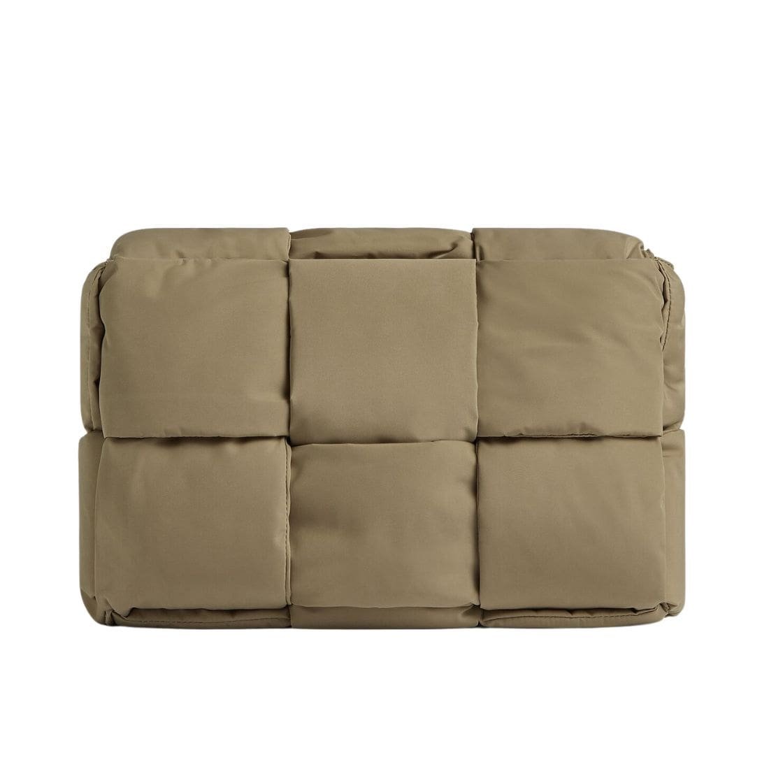 The design of the Pillow Cassette is characterized by clean lines and geometric precision, exuding a sense of modernity while maintaining a timeless allure. Its silhouette is structured yet inviting, offering a plush surface for relaxation and lounging. The distinctive quilted pattern, reminiscent of the brand’s iconic Intrecciato weave, adds a layer of visual interest and depth, creating a captivating interplay of light and shadow.