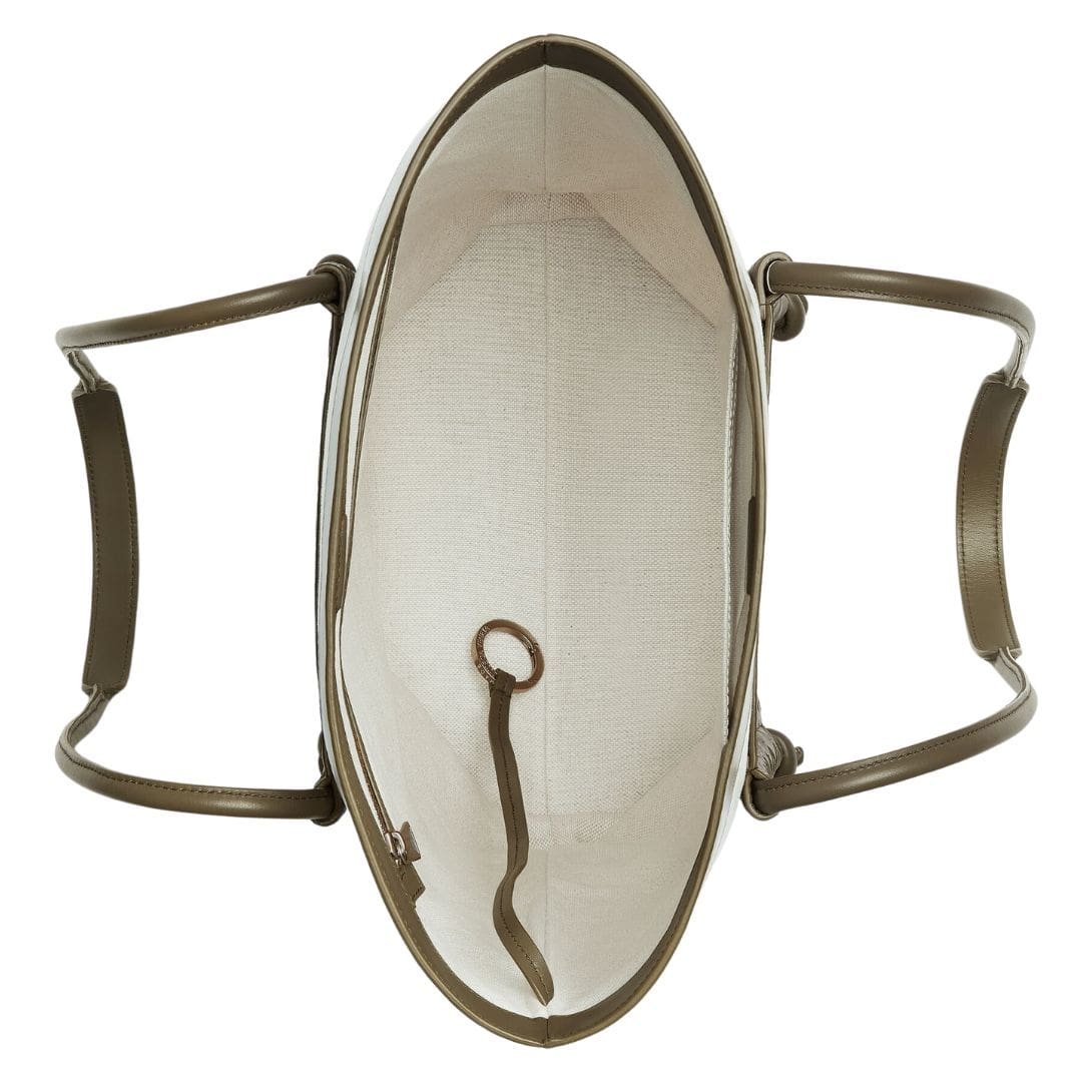 The Portello Tote is designed with a spacious interior, making it ideal for carrying essentials and more. It features a roomy main compartment that can accommodate larger items such as a laptop, documents, and personal belongings, making it perfect for work or travel. Inside, there are also smaller pockets and compartments to keep smaller items organized and easily accessible.