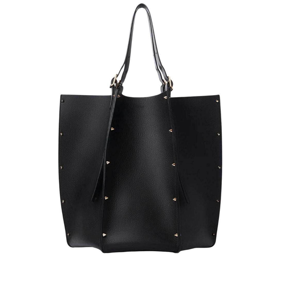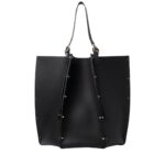 Step into the realm of timeless sophistication with the large CHLOE Carmela Tote Bag Black, a captivating fusion of modern design and luxurious craftsmanship. Crafted from exquisite-grained bull skin, this statement accessory exudes an aura of understated elegance, elevated by the line’s signature spike studs that adorn its exterior, effortlessly catching and reflecting the light with every movement.