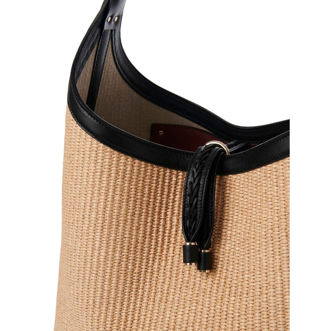 Crafted with meticulous attention to detail, the Marcie hobo bag is a tactile masterpiece, weaving together a textural interplay of raffia and supple calfskin. Its artisanal charm is accentuated by the presence of the line’s signature metallic piece adorning the leather handle, a nod to its heritage and craftsmanship.