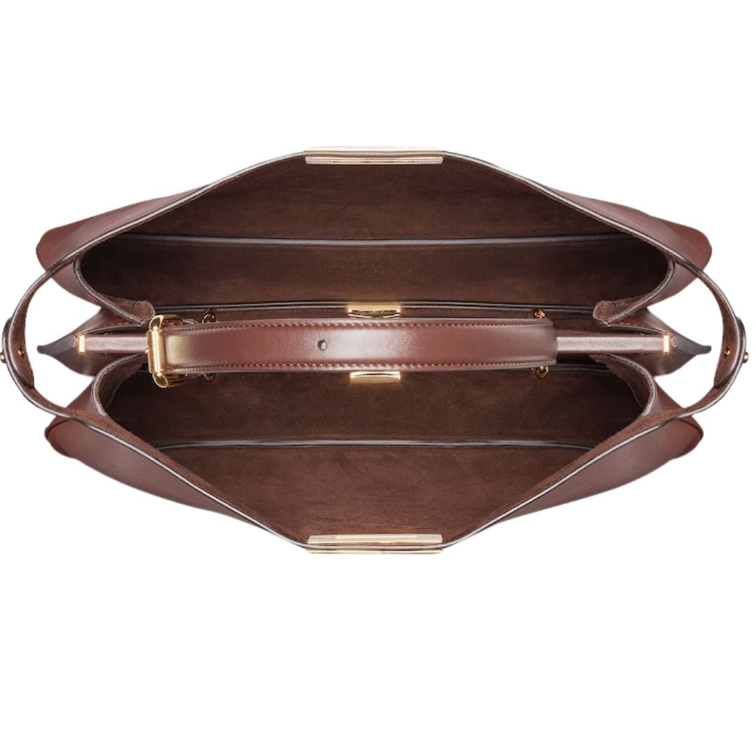 Crafted from dark brown calfskin with a silky finish, the bag boasts a luxurious suede-lined interior. It features two compartments divided by a stiff partition, complemented by a leather pocket adorned with a gold-colored FENDI logo print.