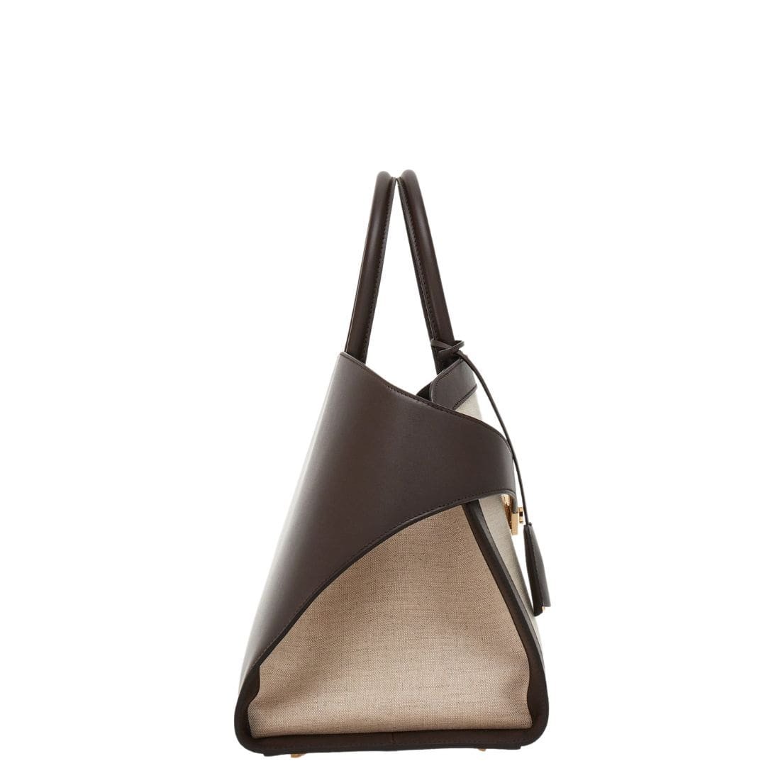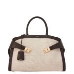 The juxtaposition of materials further enhances the bag’s allure, as the front panel, crafted from cotton linen canvas, creates a striking contrast against the supple leather. The zip fastening, discreetly positioned at the top, grants access to a meticulously lined interior adorned with a zip pocket, offering both style and functionality in equal measure.