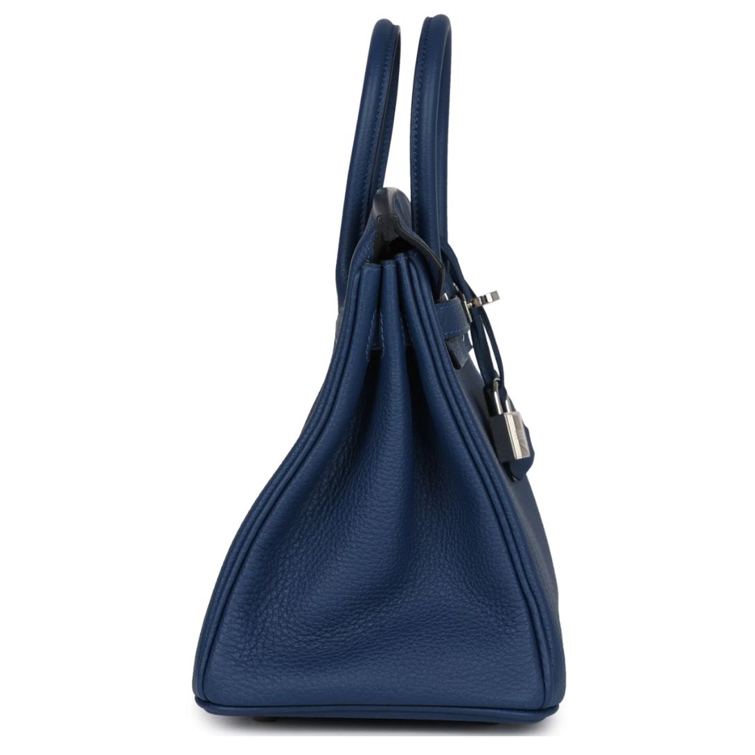 This Hermès Birkin in Deep Bleu togo leather is in new condition with palladium hardware, providing timeless sophistication with Hermès packaging and accessories included.