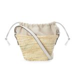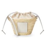 This chic accessory features a natural and tan color scheme, exuding a relaxed yet sophisticated vibe. Crafted from Loewe Bucket Bag With Drawstring In Palm Leaf And Calfskin leather, it blends organic texture with refined luxury, making it a standout piece in any collection.