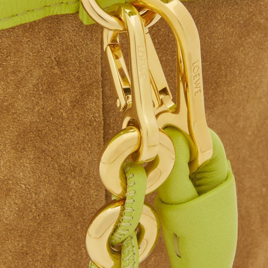 This Loewe Flamenco Purse Bucket Bag In Soft Lambskin a sophisticated gold metallic color, beautifully complementing its main material of soft lamb nappa leather. Crafted to offer both elegance and comfort, this bag is a testament to high-quality craftsmanship.
