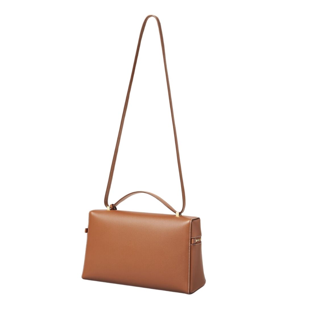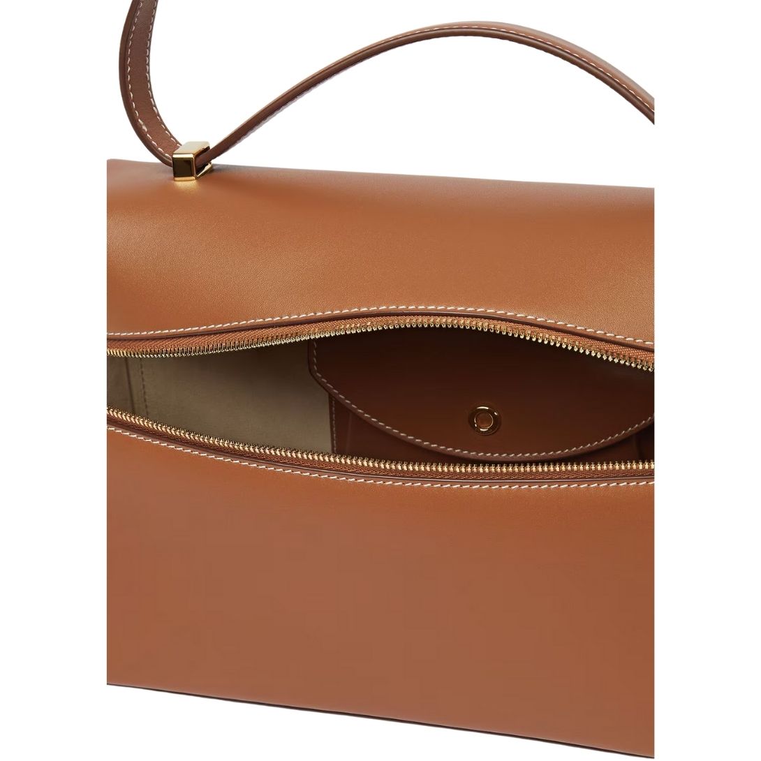 An interior pocket, secured with an eyelet button, provides practical storage for small essentials while maintaining the bag’s sleek and organized structure.