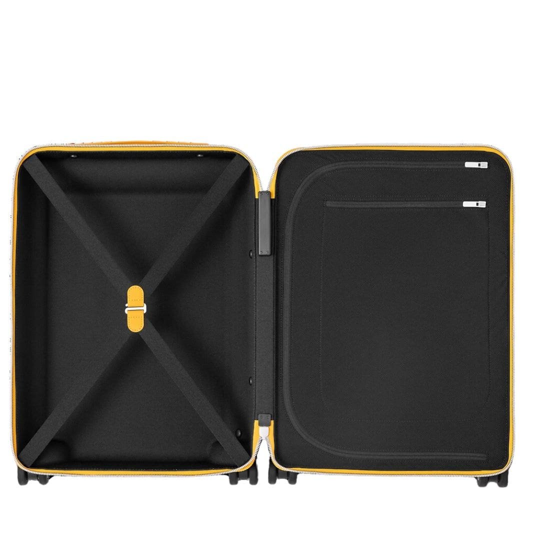 Measuring 15 x 21.7 x 8.3 inches, the LOUIS VUITTON HORIZON 55 boasts a deceptively capacious interior, thanks to its innovative design featuring a wide external cane, ensuring the interior remains impeccably flat. Crafted from luxurious Taurillon Monogram cowhide leather, accented with refined cowhide leather trim and leather corners, it exudes an aura of timeless elegance.