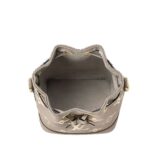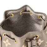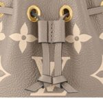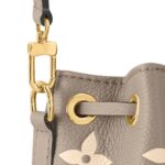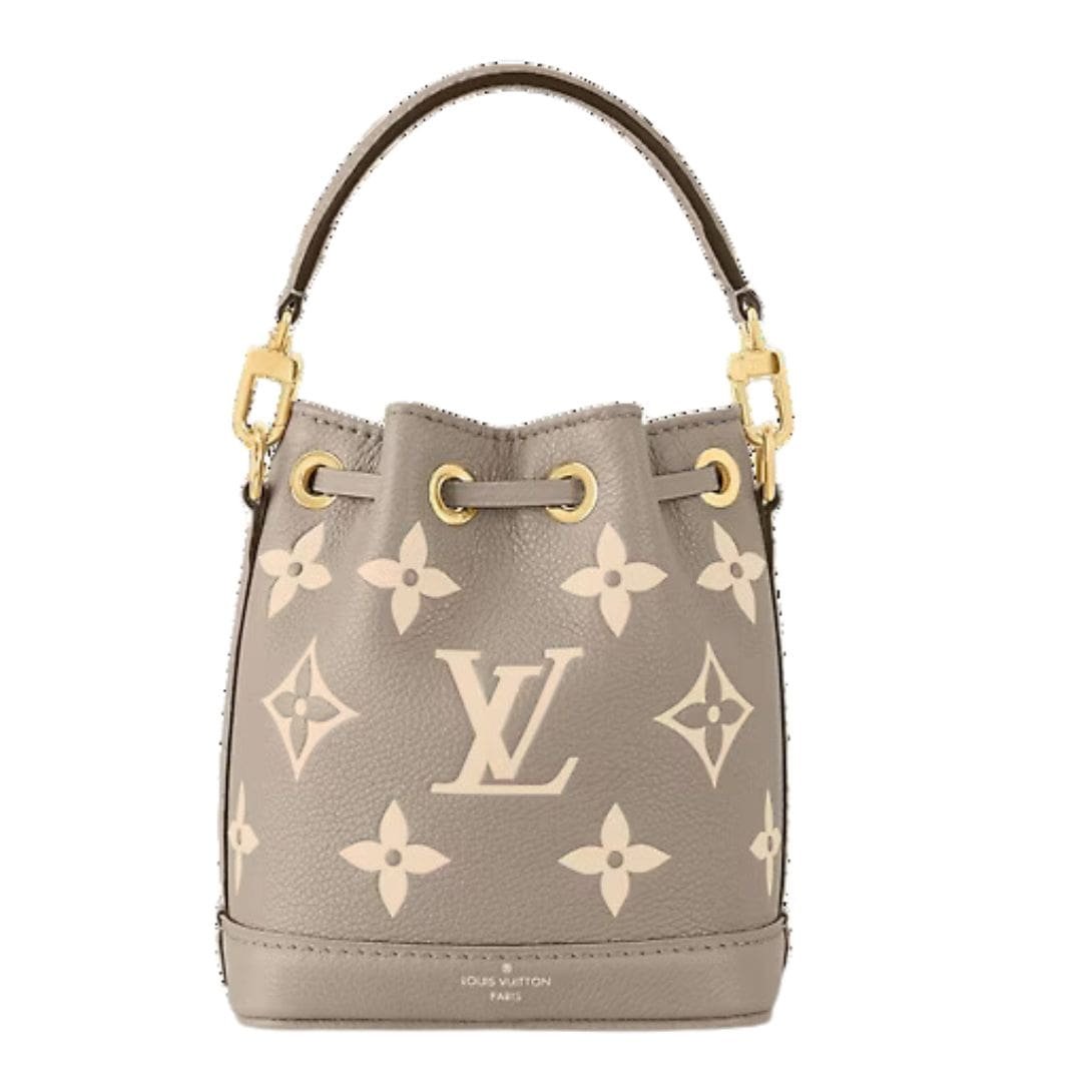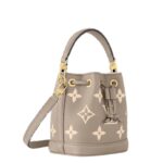 Measuring a compact 5.1 x 6.3 x 3.9 inches (length x height x width), the LOUIS VUITTON NANO NOE is designed to accompany you on all your adventures. Its sleek silhouette in Tourterelle Gray and Cream is accentuated by grained cowhide-leather trim and complemented by gold-color hardware, adding a touch of sophistication to its design.