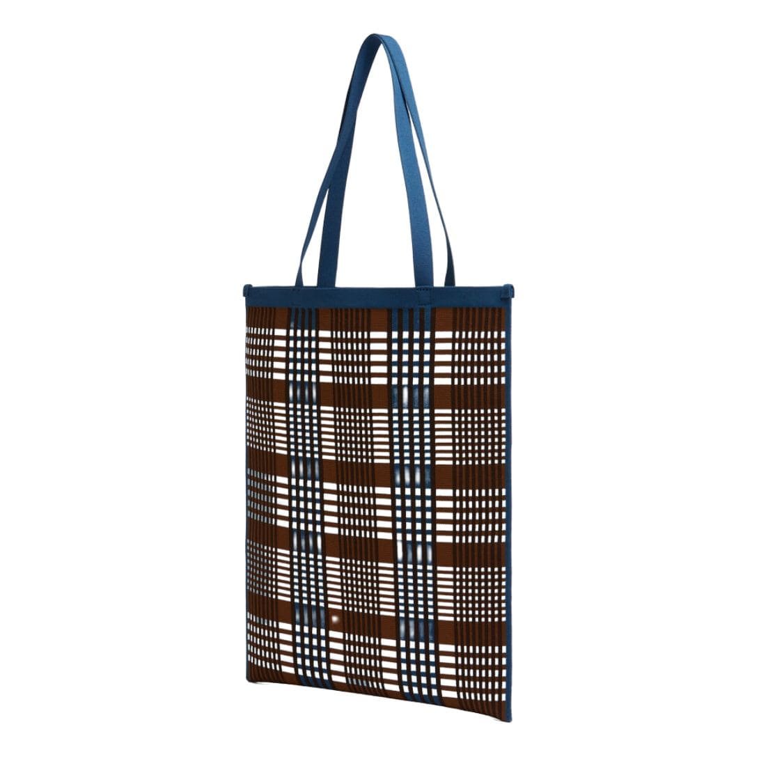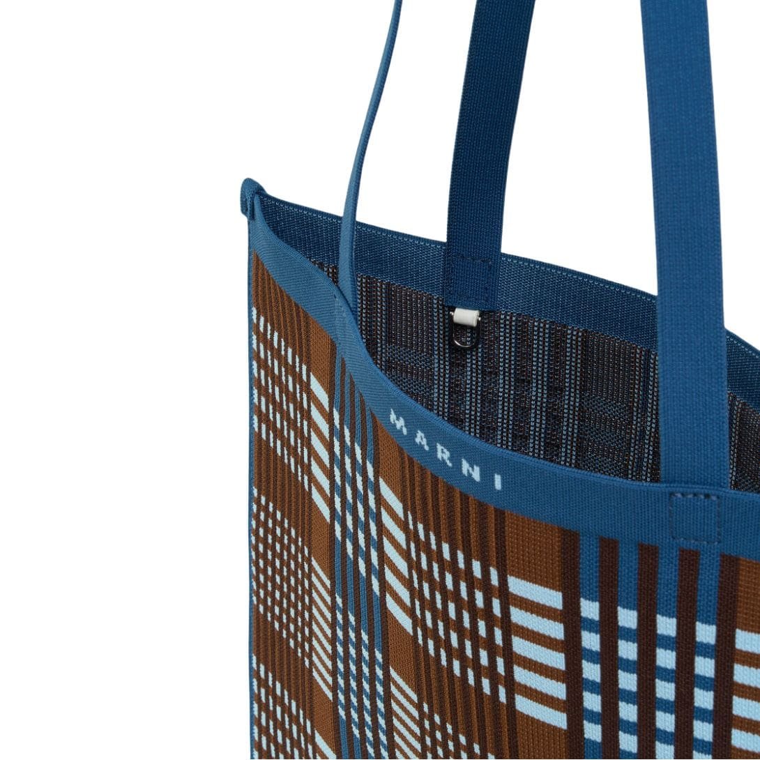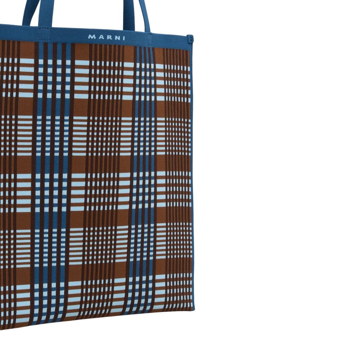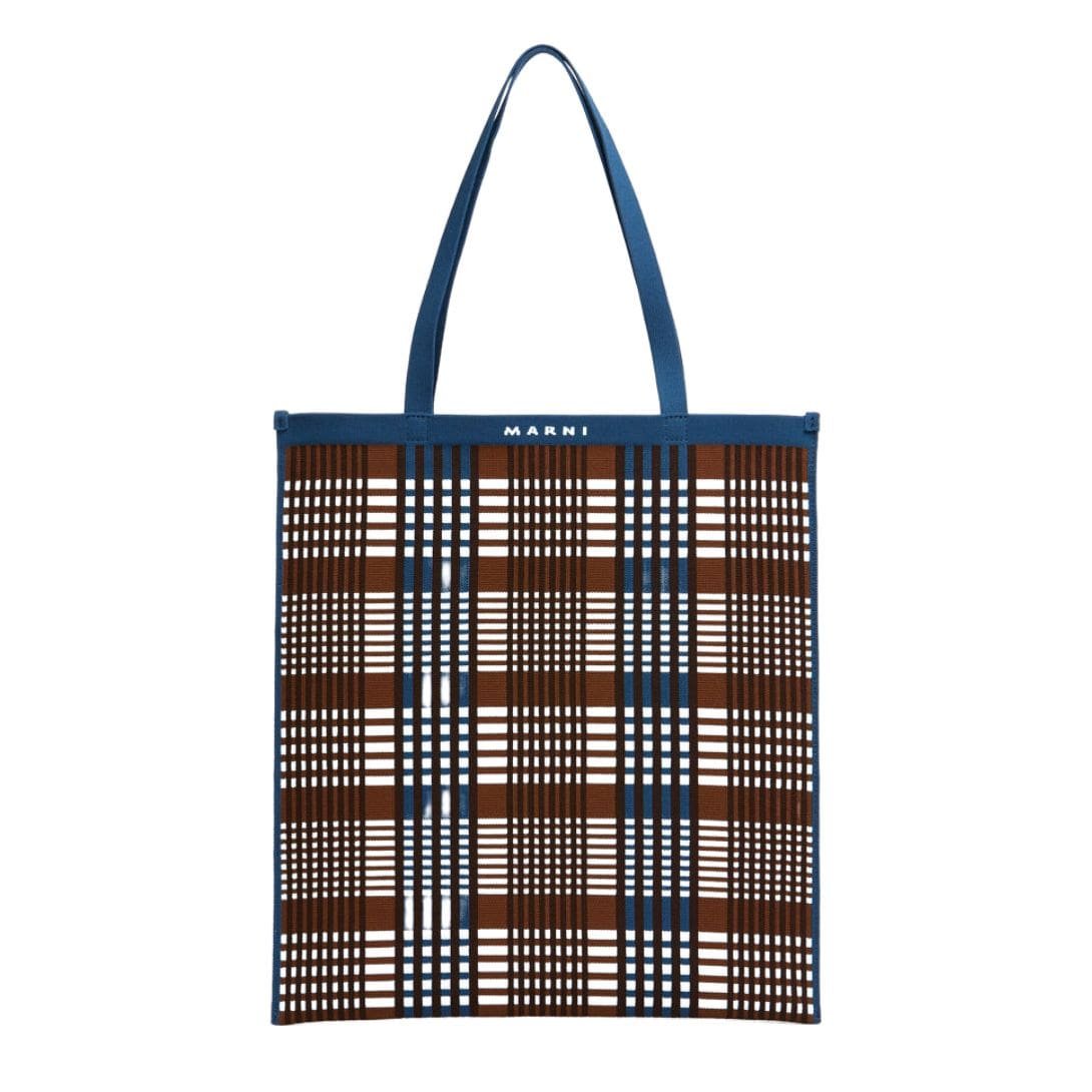 MARNI BLUE AND BROWN JACQUARD CHECK FLAT TOTE BAG