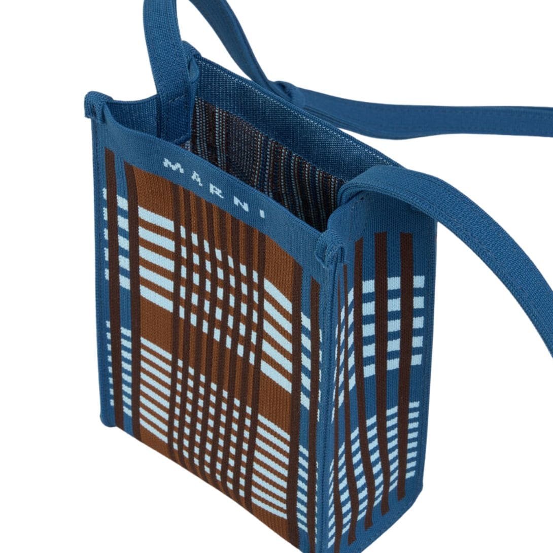 The unique checkered pattern, rendered in a high-quality jacquard fabric, showcases Marni’s commitment to luxury and detail. The interplay of blue and brown tones creates a visually striking effect, while the texture adds depth and dimension to the bag’s overall aesthetic. This design choice not only reflects a modern sensibility but also ensures the bag remains timeless, seamlessly complementing a variety of outfits and occasions.