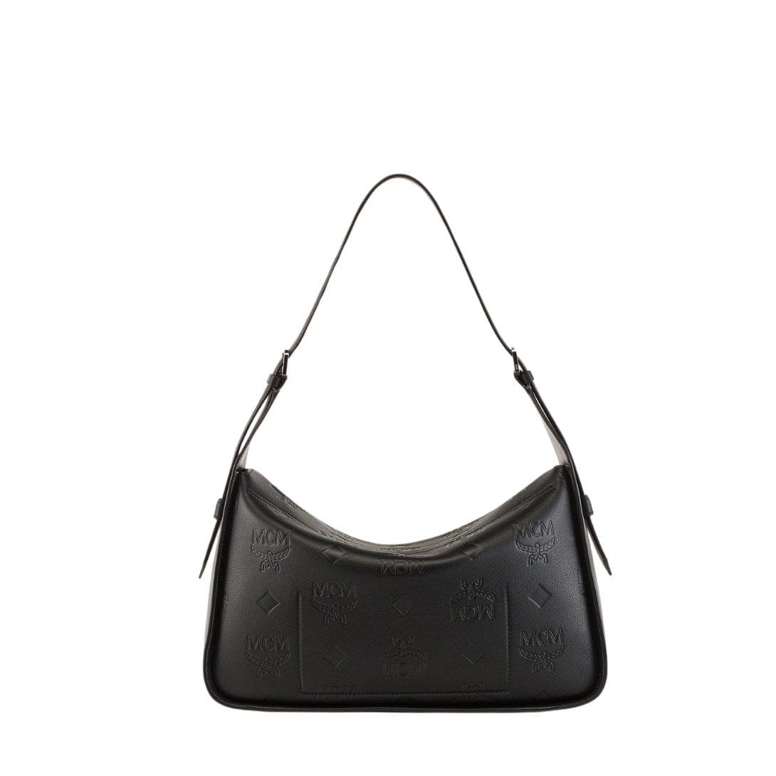 Step into the world of luxury and functionality with the spacious and stylish MCM Medium Aren Flap Hobo Bag In Embossed Monogram Leather black. Crafted with precision and finesse, this hobo bag redefines contemporary elegance with its robust luggage-inspired frame and soft natural Nappa leather body, embossed with the iconic monogram pattern.