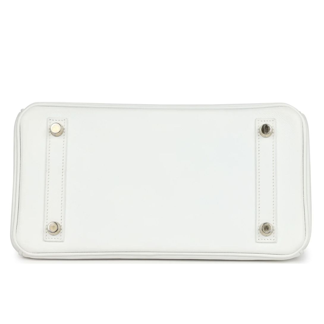 This exquisite Birkin bag is crafted in White Epsom leather with gold hardware, featuring tonal stitching, a front flap with two straps and a toggle closure, a clochette with a lock and two keys, and double rolled handles for effortless elegance.