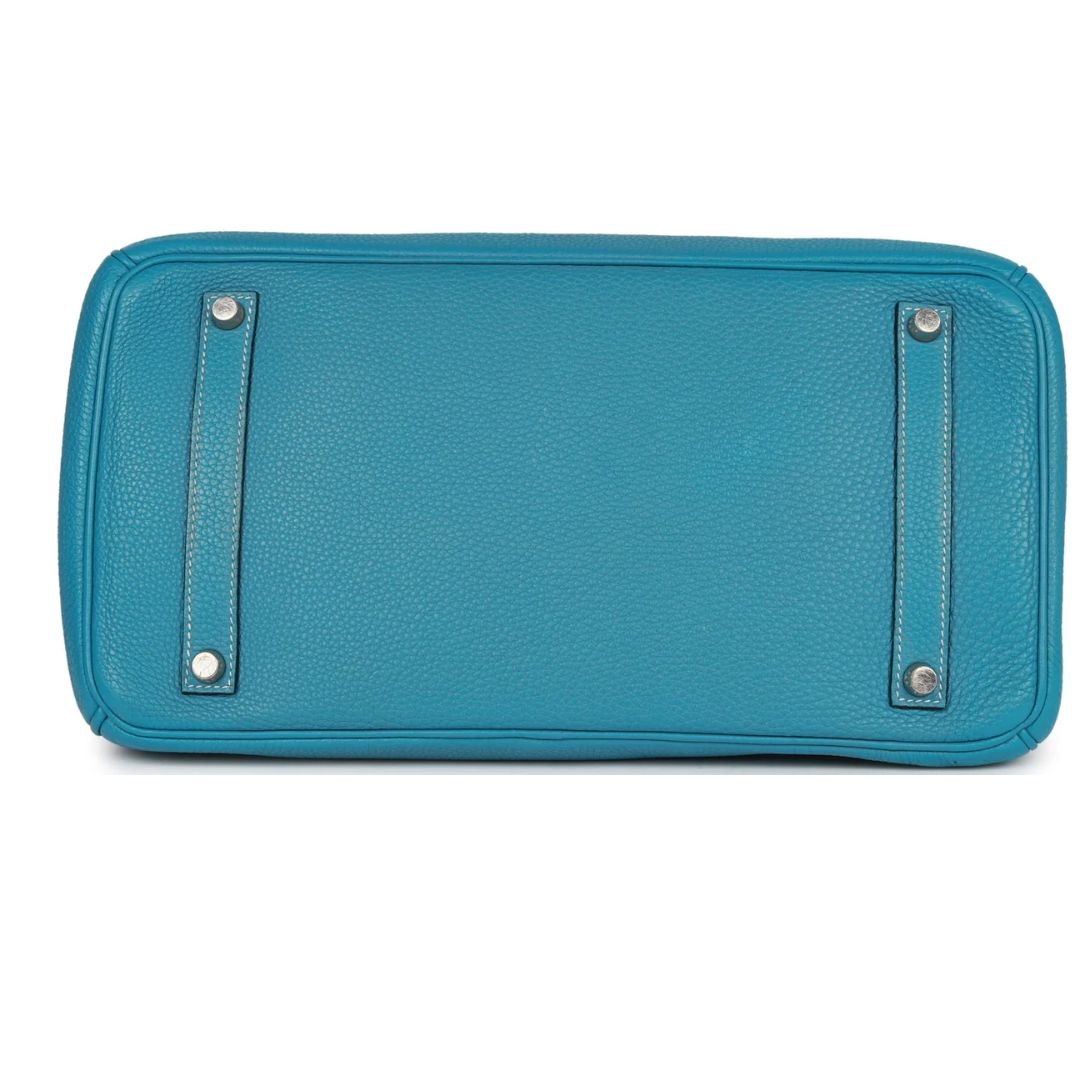 This Birkin 35 is crafted in Bleu Jean Togo leather with palladium hardware, featuring white contrast stitching, a front flap, two straps with a center toggle closure, a clochette with lock and two keys, and double rolled handles.