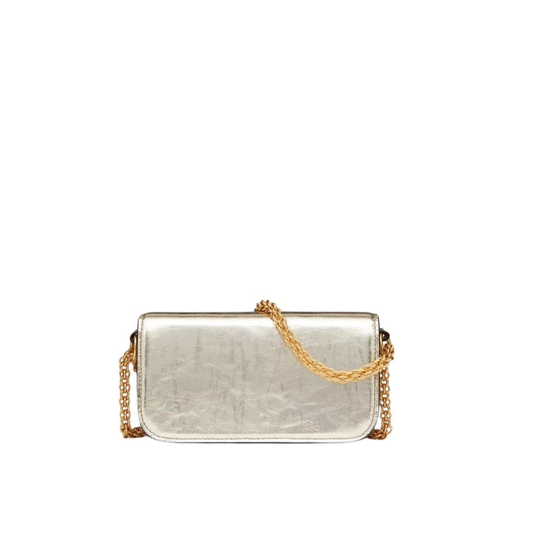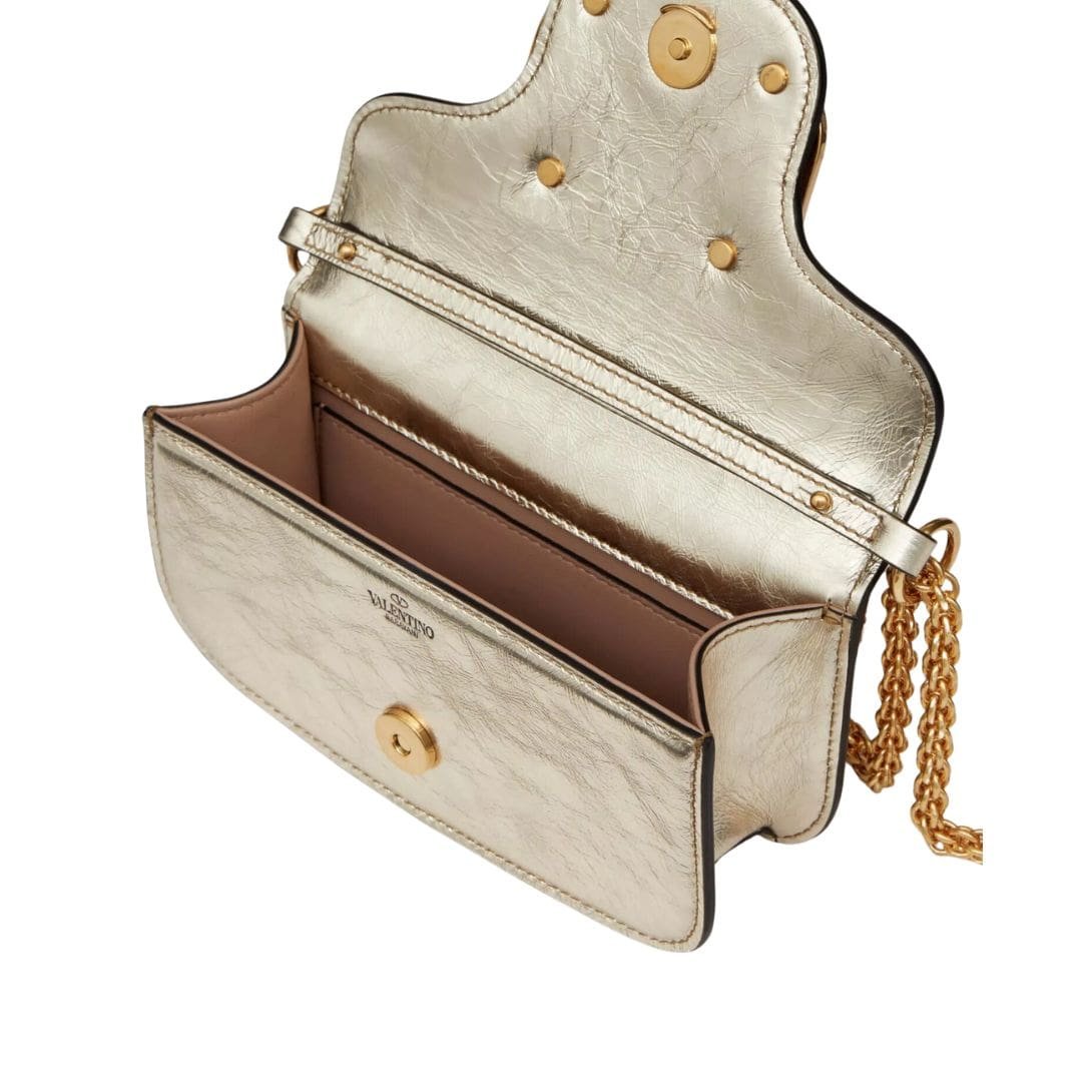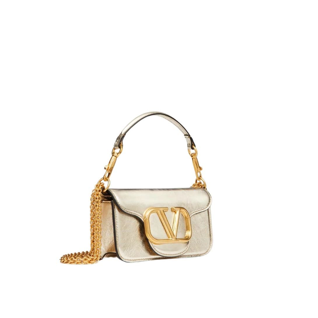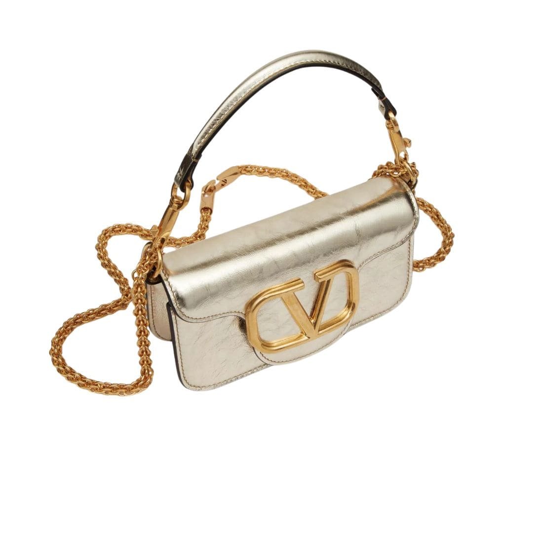 Introducing the small valentino garavani Locò metallic calfskin shoulder bag by Valentino Garavani, crafted from craquelé-effect metallic calfskin leather and adorned with the iconic VLogo Signature element. This sophisticated accessory is designed for versatility, featuring a detachable sliding chain strap and a removable handle, allowing it to be worn as a crossbody, shoulder bag, or handbag.