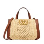 Introducing the Valentino Garavani VLogo Signature raffia small handbag, meticulously crafted from synthetic raffia with leather trim, featuring the iconic VLogo Signature element gracing the front.